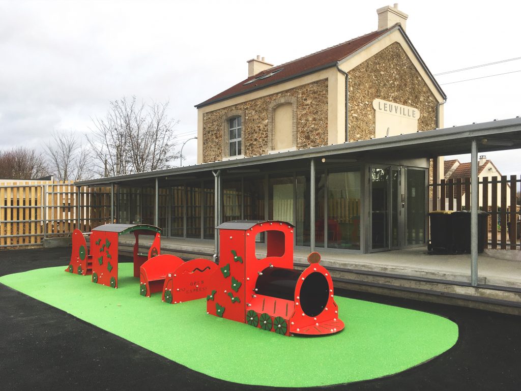 Tout a été pensé et mis en œuvre pour redonner à ce bâtiment son image de gare : le hall d’entrée et le préau prennent place sous un auvent métallique dont l’implantation et la forme rappellent le quai d’une gare ; Le choix du mobilier (bancs, horloge,…), d’un petit train aux couleurs du train originel le long du quai comme jeu pour les enfants, complètent le dispositif.