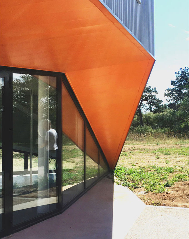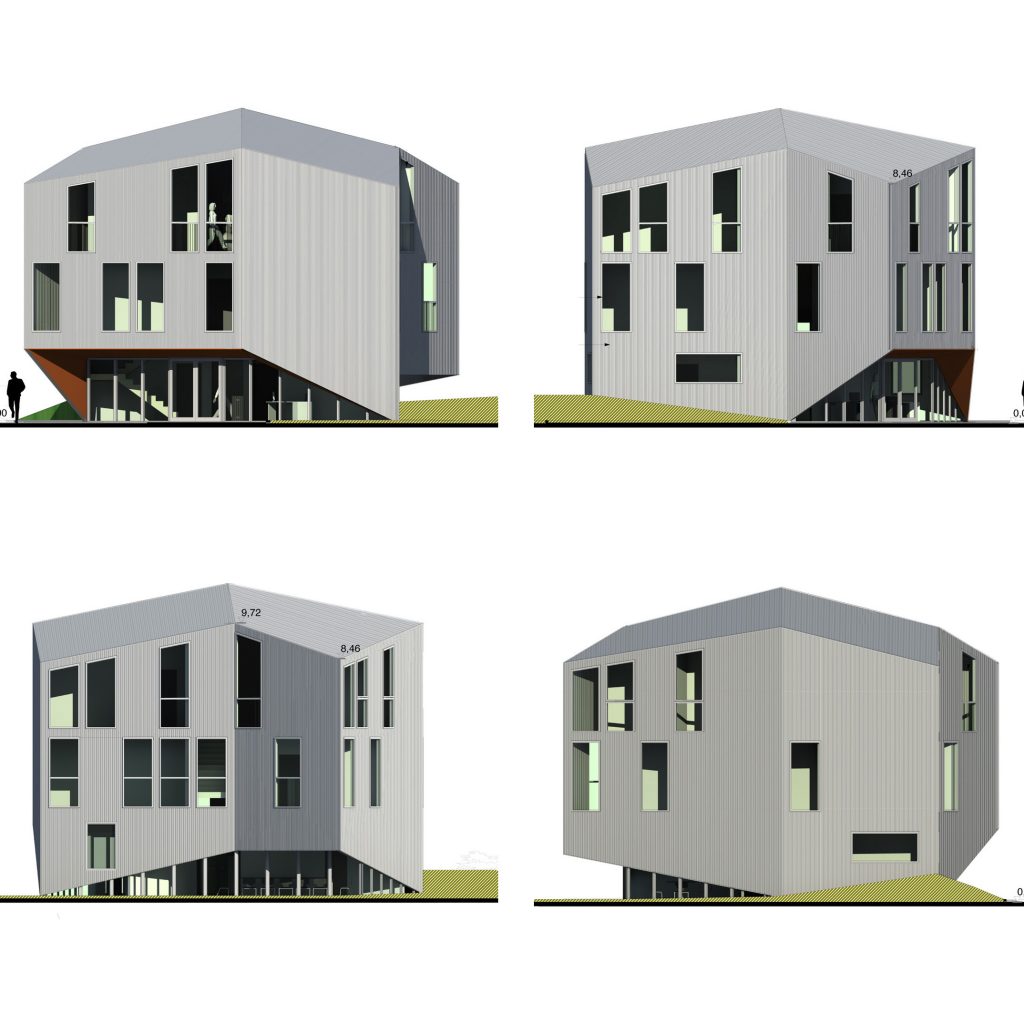 Le cube sert de point de départ à l’économie du projet. Pincé en son centre, le volume se déforme, créant ainsi une forme de toiture et multipliant les façades. Le volume se trouve gonflé, «augmenté», et peut venir se confronter, se mesurer à ses voisins. Tel un petit rocher, le projet se pose sans complexes au milieu des mastodontes voisins.